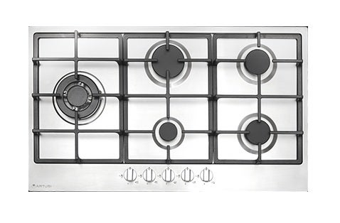 Artusi CAGH95X kitchen cooktop its 5 gas burners, including wok, enamel trivets, wok cradle and burner caps, italian sabaf burners, automatic electronic ignition and 3 pin plug and top mount.