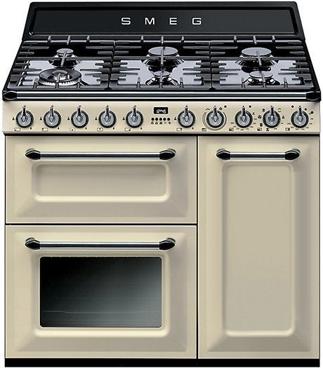 68L + 68L oven capacity7 cooking functions + defrost41L electric grill capacity6 gas burnersFlame failure device fitted to each burnerCream enamel finishMain Oven: 7 cooking functions + defrost, Thermoseal technology, 68 litre capacity, fully automatic — LED electronic clock/programmer, triple-glazed oven door (side opening), Smeg Vapour Clean, Ever-Clean enamel, 4 shelf heights, tangential cooling fanStandard Inclusions: 40mm baking tray, chrome shelf, chrome insert, roof liner, telescopic guidesMaximum Current: 36.25 amps, 8.7 kW 240 volt, 50Hz hardwired, single phaseAuxiliary Oven: Fan forced, 68 litre capacity, side-opening door, 9 cooking levels, Ever-Clean enamelStandard Inclusions: Plate rack, 4 x chrome shelves, 20mm baking tray, chrome insertElectric Grill: 41 litre capacity, fully variable grill, 2 grilling levels, Ever-Clean enamelStandard Inclusions: 20mm baking tray, grill insert, roof linerCapacity: 6 gas burners — front right: 75 mj/hr semi rapid; front centre: 3.9 mj/hr auxiliary; front left: 15.2 mj/hr ultra rapid; rear right: 12 mj/hr rapid; rear centre: 7.5 mj/hr semi rapid; rear left: 3.9 mj/hr auxiliaryGas Input: Set for natural gas, regulator supplied, adapt for ULPG, no regulator required